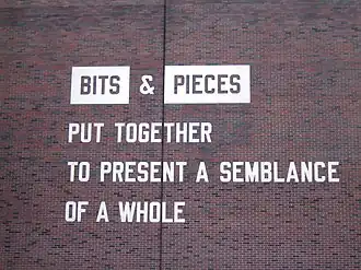 Language was a central concern for the first wave of conceptual artists of the 1960s and early 1970s. Although the utilisation of text in art was in no way novel, only in the 1960s did the artists Lawrence Weiner, Edward Ruscha,[16] Joseph Kosuth, Robert Barry, and Art & Language begin to produce art by exclusively linguistic means. Where previously language was presented as one kind of visual element alongside others, and subordinate to an overarching composition (e.g. Synthetic Cubism), the conceptual artists used language in place of brush and canvas, and allowed it to signify in its own right.[17] Of Lawrence Weiner's works Anne Rorimer writes, "The thematic content of individual works derives solely from the import of the language employed, while presentational means and contextual placement play crucial, yet separate, roles."[18]