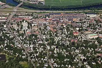 Concord is entirely within the Merrimack River watershed[10] and the city is centered on the river. The Merrimack runs from northwest to southeast through the city. The city's eastern boundary is formed by the Soucook River, which separates Concord from the town of Pembroke. The Turkey River passes through the southwestern quarter of the city. The city consists of its downtown, including the North End and South End neighborhoods, along with the four villages of Penacook, Concord Heights, East Concord, and West Concord.[11] Penacook sits along the Contoocook River, just before it flows into the Merrimack.