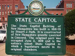 The New Hampshire State House, designed by architect Stuart Park and constructed between 1815 and 1818, is the oldest state house in which the legislature meets in its original chambers.[9] The building was remodeled in 1866, and the third story and west wing were added in 1910.