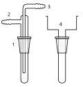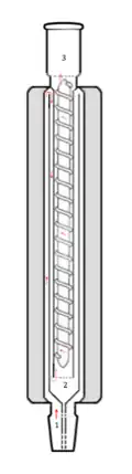 The Widmer column was developed as a doctoral research project by student Gustav Widmer at ETH Zurich in the early 1920s, combining a Golodetz-type arrangement of concentric tubes and the Dufton-type rod-with-spiral core. It consists of four concentric glass tubes and a central glass rod, with a thinner glass rod coiled around it to increase the surface area. The two outer tubes (#3 and #4) form an insulating dead air chamber (shaded). Vapor rises from a boiling flask into space (1), proceeds up through the space between tubes #2 and #3, then down the space between tubes #1 and #2, and finally up between tube #1 and the central rod. Arriving at space (3), vapor is then directed via a distillation head (glass branching adapter) to cooling and collection.[26][1][27]