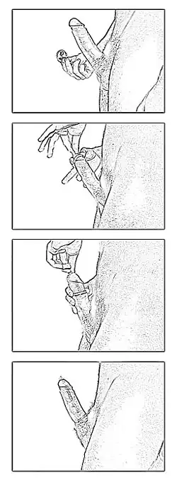 The external condom is rolled onto an erect penis before intercourse and works by forming a physical barrier which limits skin-to-skin contact, exposure to fluids, and blocks semen from entering the body of a sexual partner.[1][8] External condoms are typically made from latex and, less commonly, from polyurethane, polyisoprene, or lamb intestine.[1] External condoms have the advantages of ease of use, ease of access, and few side effects.[1] Individuals with latex allergy should use condoms made from a material other than latex, such as polyurethane.[1] Internal condoms are typically made from polyurethane and may be used multiple times.[8]