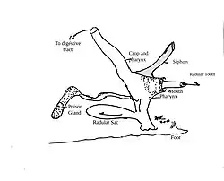 The radula tooth is hollow and barbed, and is attached to the tip of the radula in the radular sac, inside the snail's throat. When the snail detects a prey animal nearby, it extends a long flexible tube called a proboscis towards the prey. The radula tooth is loaded with venom from the venom bulb and, still attached to the radula, is fired from the proboscis into the prey by a powerful muscular contraction. The venom can paralyze smaller fish almost instantly. The snail then retracts the radula, drawing the subdued prey into the mouth. After the prey has been digested, the cone snail will regurgitate any indigestible material, such as spines and scales, along with the harpoon. There is always a radular tooth in the radular sac. A tooth may also be used in self-defense when the snail feels threatened.[16][17]