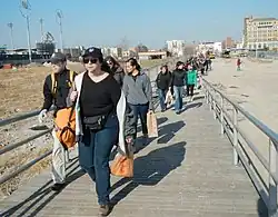 The perimeter of Coney Island features manmade structures designed to maintain its current shape. The beaches are currently not a natural feature; the sand that is naturally supposed to replenish Coney Island is cut off by the jetty at Breezy Point, Queens.[8][9]: 337 Sand has been redeposited on the beaches via beach nourishment since the construction of Riegelmann Boardwalk in 1922–1923,[10] and is held in place by around two dozen groynes. A large sand-replenishing project along Coney Island and Brighton Beach took place in the 1990s.[9]: 337 Sheepshead Bay at the peninsula's northeast corner is, for the most part, enclosed in bulkheads.[9] Two major parks, Kaiser Park and Coney Island Creek Park, are located on the northwest side of the peninsula along Coney Island Creek.[11][12] A 2023 study found that Coney Island was sinking at a rate of about 2.6 ± 0.8 millimeters (0.102 ± 0.031 in) per year, making it among the fastest-sinking locations in New York City;[13] this is mainly because parts of the neighborhood were created by land reclamation.[13][14]