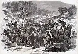 Some soldiers also deserted for ideological reasons.[59] A growing threat to the solidarity of the Confederacy was dissatisfaction in the Appalachian Mountains districts caused by lingering Unionism and a distrust of the power wielded by the slave-holding class. Many of their soldiers deserted, returned home, and formed a military force that fought off Regular Army units trying to capture and punish them.[60][61] North Carolina lost nearly a quarter of its soldiers (24,122) to desertion. This was the highest rate of desertion of any Confederate state.[62][63]