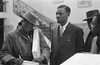 An African nationalist movement developed in the Belgian Congo during the 1950s, primarily among the évolués. The movement was divided into a number of parties and groups which were broadly divided on ethnic and geographical lines and opposed to one another.[14] The largest, the Mouvement National Congolais (MNC), was a united front organisation dedicated to achieving independence "within a reasonable" time.[15] It was created around a charter which was signed by, among others, Patrice Lumumba, Cyrille Adoula and Joseph Iléo, but others accused the party of being too moderate.[16] Lumumba became a leading figure within the MNC, and by the end of 1959, the party claimed to have 58,000 members.[17]