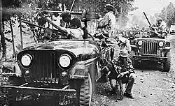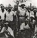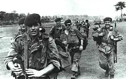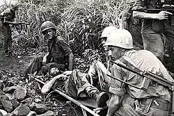 The rebels, who called themselves "Simbas" (from the Kiswahili word for "lion"), had a populist but vague ideology, loosely based on communism, which prioritised equality and aimed to increase overall wealth.[99] Most of the active revolutionaries were young men who hoped that the rebellion would provide them with opportunities which the government had not.[100] The Simbas used magic to initiate members and believed that, by following a moral code, they could become invulnerable to bullets.[101] Magic was also very important to the rebels who also made extensive use of witchcraft to protect themselves and also demoralise their ANC opponents.[102] As they advanced, the rebels perpetrated numerous massacres in the territory they captured in order to remove political opposition and terrorise the population.[103] About 1,000 to 2,000 Westernized Congolese were murdered in Stanleyville alone, while the rebels initially left Whites and foreigners mostly alone.[104] ONUC was in the process of withdrawing when the rebellions started and had only 5,500 personnel, most whom were deployed in the eastern part of the country and stranded by the conflict. Straggling Western missionaries retreated to their respective embassies, which in turn requested UN assistance.[105] A small force of peacekeepers was assembled and subsequently dispatched to the Kwilu region to retrieve fleeing missionaries.[106] Rescue operations continued throughout March and April and resulted in the successful recovery of over 100 missionaries.[107]