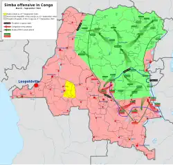 Disruption in the rural Congo begun with agitation by Lumumbists, led by Mulele, among the Pende and Mbundu peoples.[94][96] By the end of 1963, there was unrest in regions of the central and eastern Congo. The Kwilu Rebellion broke out on 16 January 1964 in the cities of Idiofa and Gungu in Kwilu Province.[97] Further disruption and uprisings then spread to Kivu in the east and later to Albertville, sparking further insurrection elsewhere in the Congo and the outbreak of the larger Simba Rebellion.[98][97] The rebels began to expand their territory and rapidly advance northwards, capturing Port-Émpain, Stanleyville, Paulis and Lisala between July and August.[97]
