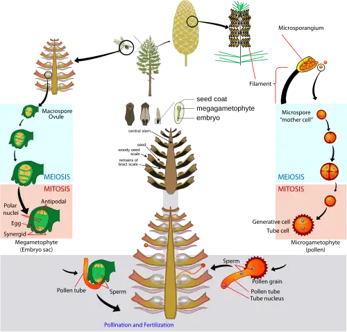 Conifers are heterosporous, generating two different types of spores: male microspores and female megaspores.[35] These spores develop on separate male and female sporophylls on separate male and female cones, usually on the same tree.[36]