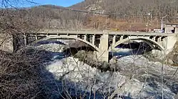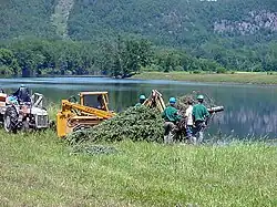 Starting about 1865,[41] the river was used for massive logging drives from Third Connecticut Lake to initially water powered sawmills near Enfield Falls. Trees cut adjacent to tributary streams including Perry Stream and Indian Stream in Pittsburg, New Hampshire, Halls Stream on the Quebec–New Hampshire border, Simms Stream, the Mohawk River of New Hampshire, and the Nulhegan River basin in Essex County, Vermont, would be flushed into the main river by the release of water impounded behind splash dams. Several log drivers died trying to move logs through Perry Falls in Pittsburg. Teams of men would wait at Canaan, Vermont, to protect the bridges from log jams. Men guided logs through a 400-foot (120 m) drop along the length of Fifteen-Mile Falls[41] (now submerged under Moore and Comerford reservoirs), and through Logan's Rips at Fitzdale, Mulligan's Lower Pitch, and Seven Islands. The White River from Vermont and Ammonoosuc River from New Hampshire brought more logs into the Connecticut. A log boom was built between Wells River, Vermont, and Woodsville, New Hampshire, to hold the logs briefly and release them gradually to avoid jams in the Ox Bow section of river just downstream in Haverhill. Men detailed to this work utilized Woodsville's saloons and red-light district.[42] Some of the logs were destined for mills in Wilder and Bellows Falls, Vermont, while others were sluiced over the Bellows Falls dam. North Walpole, New Hampshire, contained twelve to eighteen saloons, patronized by the log drivers.[43] Mount Tom was the landmark the log drivers used to gauge the distance to the final mills near Holyoke, Massachusetts.[44] These spring drives were stopped after 1915, when pleasure boat owners complained about the hazards to navigation.[45] A final drive in 1918 conducted to meet World War I pulp demand consisted of 100,000 cords of four-foot logs controlled by 500 workers, representing 65 million feet of logs.[41]