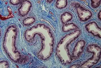![]() Section of epididymis. Connective tissue (blue) is seen supporting the epithelium (purple). | |