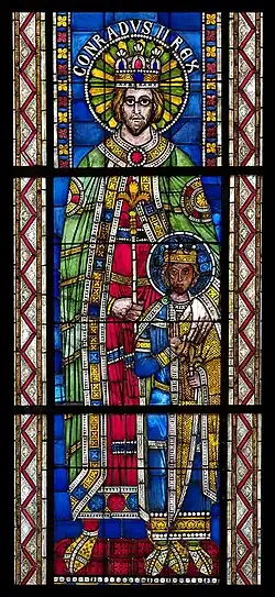 The son of Franconian count Henry of Speyer (also Henry of Worms) and Adelaide of Metz of the Matfriding dynasty,[2] that had ruled the Duchy of Lorraine from 959 until 972, Conrad inherited the titles of count of Speyer and Worms during childhood after his father had died around the year 990. He extended his influence beyond his inherited lands, as he came into favour of the princes of the kingdom. When the imperial dynastic line was left without a successor after Emperor Henry II's death in 1024, on 4 September an assembly of the imperial princes appointed the 34-year-old Conrad king (Rex romanorum).[3][4]