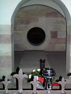 Initially, Conrad made little progress against Odo and had to withdraw to Zürich in March.[77] In April 1033 he negotiated a treaty of alliance with Henry I of France, which was completed at the end of May in a personal interview at Deville on the Meuse. Both monarchs had Odo for an enemy, since he had supported the claims of Henry I's younger brother to the French crown. Conrad might therefore have been given a free hand by his ally to invade Odo's French fiefs.[78] In two large-scale military summer campaigns in 1033 and 1034, Conrad defeated Odo.[79] On 1 August 1034, Conrad officially incorporated Burgundy into the Holy Roman Empire at a ceremony held in the Cathedral of Geneva.[79]