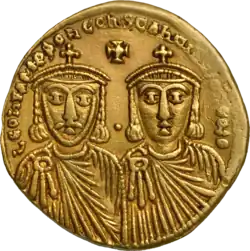 Constantine was born in Constantinople, the son and successor of Emperor Leo III and his wife Maria. In the Easter of 720, at two years of age, he was associated with his father on the throne, and crowned co-emperor by Patriarch Germanus I.[1] In Byzantine political theory more than one emperor could share the throne; however, although all were accorded the same ceremonial status, only one emperor wielded ultimate power. As the position of emperor was in theory, and sometimes in practise, elective rather than strictly hereditary, a ruling emperor would often associate a son or other chosen successor with himself as a co-emperor to ensure the eventual succession.[6] To celebrate the coronation of his son, Leo III introduced a new silver coin, the miliaresion; worth one-twelfth of a gold nomisma, it soon became an integral part of the Byzantine economy. In 726, Constantine's father issued the Ecloga; a revised legal code, it was attributed to both father and son jointly. Constantine married Tzitzak, daughter of the Khazar khagan Bihar, an important Byzantine ally. His new bride was baptized Irene (Eirēnē, "peace") in 732. On his father's death, Constantine succeeded as sole emperor on 18 June 741.[7][8][9][10]
