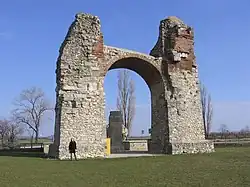 In Poetovio, Gallus was arrested by the soldiers of Constantius under the command of Barbatio.[57] Gallus was then moved to Pola and interrogated. Gallus claimed that it was Constantina who was to blame for all the trouble while he was in charge of the eastern provinces.[58] This angered Constantius so greatly that he immediately ordered Gallus's execution.[59] He soon changed his mind, however, and recanted the order.[60][61][62] Unfortunately for Gallus, this second order was delayed by Eusebius, one of Constantius's eunuchs, and Gallus was executed.[56]