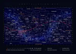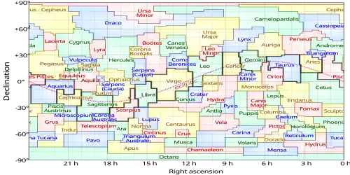 Equirectangular plot of the 88 IAU designated constellations, those of the zodiac outlined
