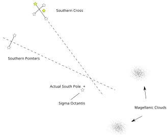 Sigma Octantis is the closest star approximating a southern pole star, but is faint in the night sky. Thus, the pole can be triangulated using the constellation Crux as well as the stars Alpha and Beta Centauri (about 30° counterclockwise from Crux) of the constellation Centaurus (arching over Crux).[22]