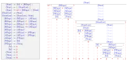 Simplified excerpt of the formal grammar[1] for the C programming language (left), and a derivation of a piece of C code (right) from the nonterminal symbol . Nonterminal symbols are blue and terminal symbols are red.