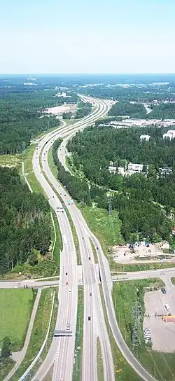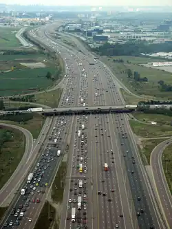 In Canada, the first precursor with semi-controlled access was The Middle Road between Hamilton and Toronto, which featured a median divider between opposing traffic flow, as well as the nation's first cloverleaf interchange. This highway developed into the Queen Elizabeth Way, which featured a cloverleaf and trumpet interchange when it opened in 1937, and until the Second World War, boasted the longest illuminated stretch of roadway built.[18] A decade later, the first section of Highway 401 was opened, based on earlier designs. It has since gone on to become the busiest highway in the world.