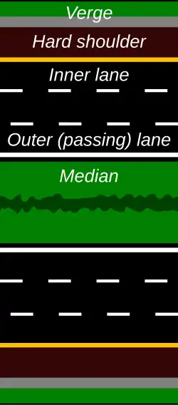 - Cross sections incorporating a minimum of two through-traffic lanes for each direction of travel, with a typical width of 3.50 to 3.75 m (11 ft 6 in to 12 ft 4 in) each, separated by a central median.