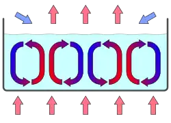A convection cell, also known as a Bénard cell, is a characteristic fluid flow pattern in many convection systems. A rising body of fluid typically loses heat because it encounters a colder surface. In liquid, this occurs because it exchanges heat with colder liquid through direct exchange. In the example of the Earth's atmosphere, this occurs because it radiates heat. Because of this heat loss the fluid becomes denser than the fluid underneath it, which is still rising. Since it cannot descend through the rising fluid, it moves to one side. At some distance, its downward force overcomes the rising force beneath it, and the fluid begins to descend. As it descends, it warms again and the cycle repeats itself. Additionally, convection cells can arise due to density variations resulting from differences in the composition of electrolytes.[13]