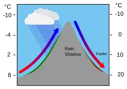 Some more localized phenomena than global atmospheric movement are also due to convection, including wind and some of the hydrologic cycle. For example, a foehn wind is a down-slope wind which occurs on the downwind side of a mountain range. It results from the adiabatic warming of air which has dropped most of its moisture on windward slopes.[14] Because of the different adiabatic lapse rates of moist and dry air, the air on the leeward slopes becomes warmer than at the same height on the windward slopes.