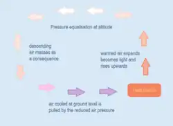 A thermal column (or thermal) is a vertical section of rising air in the lower altitudes of the Earth's atmosphere. Thermals are created by the uneven heating of the Earth's surface from solar radiation. The Sun warms the ground, which in turn warms the air directly above it. The warmer air expands, becoming less dense than the surrounding air mass, and creating a thermal low.[15][16] The mass of lighter air rises, and as it does, it cools by expansion at lower air pressures. It stops rising when it has cooled to the same temperature as the surrounding air. Associated with a thermal is a downward flow surrounding the thermal column. The downward moving exterior is caused by colder air being displaced at the top of the thermal. Another convection-driven weather effect is the sea breeze.[17][18]