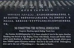 On 18 October 1860, at the culmination of the Second Opium War, the British and French troops entered the Forbidden City in Peking. Following the decisive defeat of the Chinese, Prince Gong was compelled to sign two treaties on behalf of the Qing government with Lord Elgin and Baron Gros, who represented Britain and France respectively.[1] Although Russia had not been a belligerent, Prince Gong also signed a treaty with Nikolay Ignatyev.