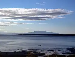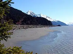 The Cook Inlet and both its arms are bodies of brackish water, containing a turbid mix of ocean salt-water and freshwater runoff from the various rivers and streams. The narrow channel of the inlet funnels the tides creating very fast-moving currents, rip tides, and occasional bore tides.[3] Cook Inlet watershed is the most populated watershed in Alaska. The watershed covers about 100,000 km2 (39,000 sq mi) of southern Alaska, east of the Aleutian Range, south and east of the Alaska Range, receiving water from its tributaries, which include the Knik River, the Little Susitna River, the Susitna and Matanuska rivers, Eagle River, Ship Creek, Resurrection Creek, Portage Creek, Kenai River, and many others. The watershed includes the drainage areas of Denali and is the collection point for the runoff from many surrounding glaciers, leading to the high turbidity and large silt deposits. Within the watershed there are several national parks and the active volcano Mount Redoubt, along with three other historically active volcanoes.[4] Cook Inlet provides navigable access to the port of Anchorage at the northern end, and to the smaller Homer port further south. Before the growth of Anchorage, Knik was the destination for most marine traffic in upper Cook Inlet. Approximately 400,000 people live within the Cook Inlet watershed.