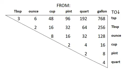 Measures are classified as either dry measures or fluid measures. Some of the fluid and dry measures have similar names, but the actual measured volume is quite different. A recipe will generally specify which measurement is required. U.S. recipes are commonly in terms of fluid measures, even for dry ingredients. Most of these units derive from earlier English units, as applied to the U.S. gallon. Typically they follow a pattern of binary submultiples, where each larger measure consists of two units of the next-smallest measure.[15][16][17] An exception is with the commonly used teaspoon as one-third of a tablespoon.