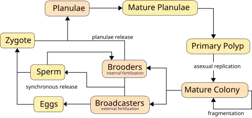 Corals predominantly reproduce sexually. About 25% of hermatypic corals (reef-building stony corals) form single-sex (gonochoristic) colonies, while the rest are hermaphroditic.[44] It is estimated more than 67% of coral are simultaneous hermaphrodites.[45]