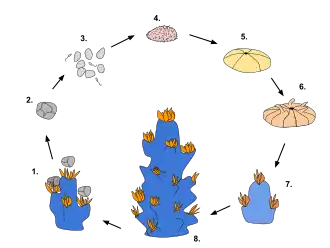The time from spawning to larval settlement is usually two to three days but can occur immediately or up to two months.[59] Broadcast-spawned planula larvae develop at the water's surface before descending to seek a hard surface on the benthos to which they can attach and begin a new colony.[60] The larvae often need a biological cue to induce settlement such as specific crustose coralline algae species or microbial biofilms.[61][62] High failure rates afflict many stages of this process, and even though thousands of eggs are released by each colony, few new colonies form. During settlement, larvae are inhibited by physical barriers such as sediment,[63] as well as chemical (allelopathic) barriers.[64] The larvae metamorphose into a single polyp and eventually develops into a juvenile and then adult by asexual budding and growth.