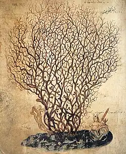The Persian polymath Al-Biruni (d.1048) classified sponges and corals as animals, arguing that they respond to touch.[6] Nevertheless, people believed corals to be plants until the eighteenth century when William Herschel used a microscope to establish that coral had the characteristic thin cell membranes of an animal.[7]