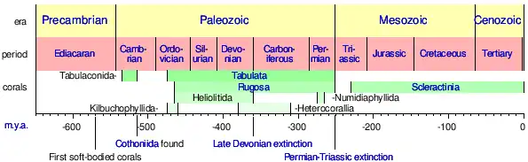 Timeline of the major coral fossil record and developments from 650 m.y.a. to present.[99][100] |