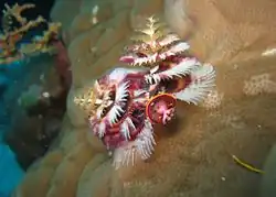 The sea hosts numerous species of anemones, sponges, worms (e.g. Spirobranchus giganteus shown in the photograph), gastropods, lobsters, crayfish, prawns and crabs. Red algae Lithothamnion and Porolithon colour many coral reefs purple-red and the green alga Halimeda is found throughout the sea. The coastal plants consisting of only about 30–40 species, and mangroves occur in the northern part of the sea.[12] Four hundred coral species, both hard corals and soft corals inhabit the reefs.[31] The majority of these spawn gametes, breeding in mass spawning events that are triggered by the rising sea temperatures of spring and summer, the lunar cycle, and the diurnal cycle. Reefs in the inner GBR spawn during the week after the full moon in October, while the outer reefs spawn in November and December.[32] Its common soft corals belong to 36 genera.[33] There are more than 1500 fish species in the reef systems.[34] Five hundred species of marine algae or seaweed live on the reef,[31] including thirteen species of the genus Halimeda, which deposit calcareous mounds up to 100 metres (110 yd) wide, creating mini-ecosystems on their surface which have been compared to rainforest cover.[35]