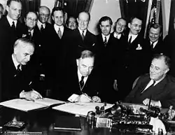 Signing of the United States-Canada Trade Agreement. Seated, L-R: Cordell Hull, William L. M. King and Franklin D. Roosevelt in Washington, on November 16, 1935.