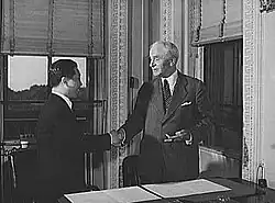 Roosevelt named him Secretary of State and appointed him to lead the American delegation to the London Economic Conference, which then collapsed when Roosevelt rejected its main plans. In 1943, Hull served as United States delegate to the Moscow Conference. At times, his main objective was to enlarge foreign trade and lower tariffs. Some of the issues concerning the American role in World War II, were handled by Roosevelt working through Sumner Welles, the second-ranking official at the State Department, which caused conflicts between the two. Hull did not attend the summit meetings that Roosevelt had with Winston Churchill and Joseph Stalin.[7] In 1943 Hull ended Welles's career at the State Department by threatening to expose allegations of his homosexuality dating back to 1941,[8] and Hull threatened to resign if Welles was not let go due to the allegations and possibly concern that they could be used to blackmail Welles.[9][10]