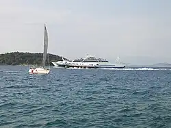 Corfu (/kɔːrˈf(j)/ kor-FOO, -⁠FEW, US also /ˈkɔːrf(j)/ KOR-foo, -⁠few[1]) or Kerkyra (Greek: Κέρκυρα, romanized: Kérkyra, pronounced [ˈcercira] )[a] is one of the Ionian Islands in western Greece, and is separated by the Straits of Corfu from the mainland of Greece and Albania.[2] It is the northernmost island on Greece's west coast except for its satellite Diapontian Islands, which are also the westernmost point of all Greece. Corfu and the Diapontian Islands mark the International Hydrographic Organization border between the Ionian Sea to the south and the Adriatic Sea to the north.[3] Within the Ionian Islands region, the regional unit of Corfu extends as far south as the Paxoi.[4] The capital and largest city of the regional unit is also named Corfu.