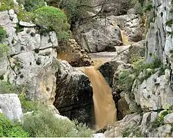 Within the territory of Corleone, a short walk from the historic center of the city, is the "Natural Park of the cascade of the two fortresses." After going through a series of narrow streets in the district of San Giuliano visitors come to the front of a small church dedicated to Our Lady of the Two Fortresses. To the left of this church winds a path that leads between the poplars, willows, and elms to the falls. Seated on the ancient square blocks in the shade of mulberry, walnut and ash trees, visitors have an unimpeded view of the waterfall. The flow of the water in the river has formed a large pool among rocks through its erosive action. The canyon contains eroded, yellow-green glauconitic rocks occupied by vegetation.[26]