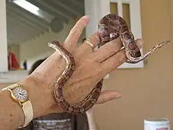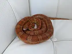 The corn snake (Pantherophis guttatus), sometimes called red rat snake[4] is a species of North American rat snake in the family Colubridae. The species subdues its small prey by constriction.[5][6] It is found throughout the southeastern and central United States. Though superficially resembling the venomous copperhead (Agkistrodon contortrix) and often killed as a result of this mistaken identity, the corn snake lacks functional venom and is harmless. The corn snake is beneficial to humans[7] because it helps control populations of wild rodent pests that damage crops and spread disease.[8]
