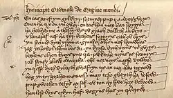 The earliest written record of the Cornish language comes from this period: a 9th-century gloss in a Latin manuscript of De Consolatione Philosophiae by Boethius, which used the words ud rocashaas. The phrase may mean "it [the mind] hated the gloomy places",[37][38] or alternatively, as Andrew Breeze suggests, "she hated the land".[39] Other sources from this period include the Saints' List, a list of almost fifty Cornish saints,[40] the Bodmin manumissions, which is a list of manumittors and slaves, the latter with mostly Cornish names,[41] and, more substantially, a Latin–Cornish glossary (the Vocabularium Cornicum or Cottonian Vocabulary), a Cornish translation of Ælfric of Eynsham's Latin–Old English Glossary,[42] which is thematically arranged into several groups, such as the Genesis creation narrative, anatomy, church hierarchy, the family, names for various kinds of artisans and their tools, flora, fauna, and household items.[43][44] The manuscript was widely thought to be in Old Welsh until the 18th century when it was identified as Cornish by Edward Lhuyd.[45] Some Brittonic glosses in the 9th-century colloquy De raris fabulis were once identified as Old Cornish, but they are more likely Old Welsh, possibly influenced by a Cornish scribe.[46] No single phonological feature distinguishes Cornish from both Welsh and Breton until the beginning of the assibilation of dental stops in Cornish, which is not found before the second half of the eleventh century,[47] and it is not always possible to distinguish Old Cornish, Old Breton, and Old Welsh orthographically.[48]