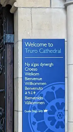 Cornwall Council's policy is to support the language, in line with the European Charter. A motion was passed in November 2009 in which the council promoted the inclusion of Cornish, as appropriate and where possible, in council publications and on signs.[105] This plan has drawn some criticism.[106] In October 2015, the council announced that staff would be encouraged to use "basic words and phrases" in Cornish when dealing with the public.[107] In 2021 Cornwall Council prohibited a marriage ceremony from being conducted in Cornish as the Marriage Act 1949 only allowed for marriage ceremonies in English or Welsh.[108]