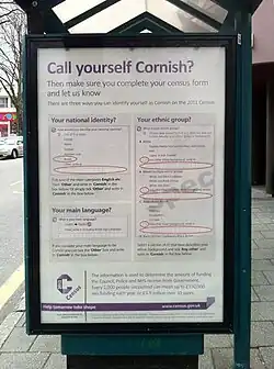 A campaign for the inclusion of a Cornish tick-box in the nationality section of the 2011 census failed to win the support of Parliament in 2009.[35][47] As a consequence, posters were created by the census organisation and Cornwall Council which advised residents how they could identify themselves as Cornish by writing it in the national identity and ethnicity sections and record Cornish in the main language section.[23] Additionally, people could record Cornwall as their country of birth.[48]