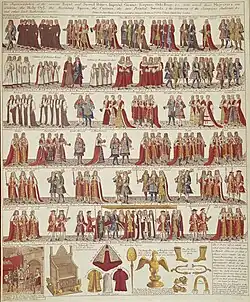 - ^ Peers have two types of robes, the "Parliamentary Robe" and the "Coronation Robe". The Coronation Robe is worn only during a coronation while the Parliamentary Robe is worn on other formal occasions such as the State Opening of Parliament.[134] See also: Privilege of peerage#Robe