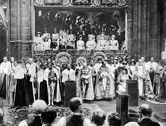 The need to include the various elements of the British Empire in coronations was not considered until 1902, when it was attended by the prime ministers and governors-general of the British Dominions, by then almost completely autonomous, and also by many of the rulers of the Indian Princely States and the various British Protectorates. An Imperial Conference was held afterwards.[41] In 1911, the procession inside Westminster Abbey included the banners of the dominions, India and the Home Nations. By 1937, the Statute of Westminster 1931 had made the dominions fully independent, and the wording of the coronation oath was amended to include their names and confine the elements concerning religion to the United Kingdom.[42]