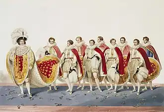 The Liber Regalis was translated into English for the first time for the coronation of James I in 1603, partly as a result of the reformation in England requiring services to be understood by the people,[19] but also an attempt by antiquarians to recover a lost English identity from before the Norman Conquest.[20] In 1685, James II, who was a Catholic, ordered a truncated version of the service omitting the Eucharist, but this was restored for later monarchs. Only four years later, the service was again revised by Henry Compton for the coronation of William III and Mary II.[21] The Latin text was resurrected for the 1714 coronation of the German-speaking George I, since it was the only common language between the king and the clergy. Perhaps because the 1761 coronation of George III had been beset by "numerous mistakes and stupidities",[22] the next time around, spectacle overshadowed the religious aspect of the service. The coronation of George IV in 1821 was an expensive and lavish affair with a vast amount of money being spent on it.[23]