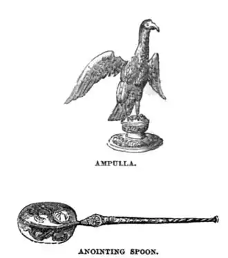 Once seated in this chair, a canopy of golden cloth was in the past held over the monarch's head for the anointing. The duty of acting as canopy-bearers was performed in recent coronations by four Knights of the Garter.[43] This element of the coronation service is considered sacred and is concealed from public gaze;[103] it has never been photographed or televised. The Dean of Westminster pours consecrated oil from an eagle-shaped ampulla into a filigreed spoon with which the Archbishop of Canterbury anoints the sovereign in the form of a cross on the hands, head, and heart.[43] The Coronation Spoon is the only part of the medieval Crown Jewels which survived the Commonwealth of England.[104] While performing the anointing, the Archbishop recites a consecratory formula recalling the anointing of King Solomon by Nathan the prophet and Zadok the priest.[43]