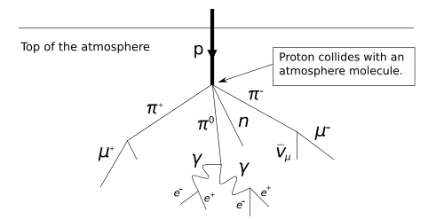 Upon striking the atmosphere, cosmic rays violently burst atoms into other bits of matter, producing large amounts of pions and muons (produced from the decay of charged pions, which have a short half-life) as well as neutrinos.[13] The neutron composition of the particle cascade increases at lower elevations, reaching between 40% and 80% of the radiation at aircraft altitudes.[14]