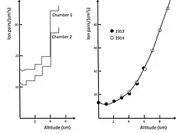 In 1912, Victor Hess carried three enhanced-accuracy Wulf electrometers[3] to an altitude of 5,300 metres in a free balloon flight. He found the ionization rate increased to twice the rate at ground level.[3] Hess ruled out the Sun as the radiation's source by making a balloon ascent during a near-total eclipse. With the moon blocking much of the Sun's visible radiation, Hess still measured rising radiation at rising altitudes.[3] He concluded that "The results of the observations seem most likely to be explained by the assumption that radiation of very high penetrating power enters from above into our atmosphere."[25] In 1913–1914, Werner Kolhörster confirmed Victor Hess's earlier results by measuring the increased ionization enthalpy rate at an altitude of 9 km.[26][27]