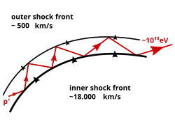 Supernovae do not produce all cosmic rays, however, and the proportion of cosmic rays that they do produce is a question which cannot be answered without deeper investigation.[61] To explain the actual process in supernovae and active galactic nuclei that accelerates the stripped atoms, physicists use shock front acceleration as a plausibility argument (see picture at right).