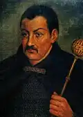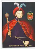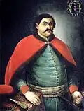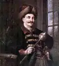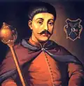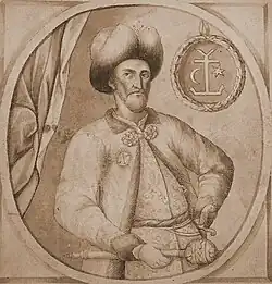 The founder of the Hetmanate, Bohdan Khmelnytsky, declared himself the ruler of the Ruthenian state to the Polish representative Adam Kysil in February 1649.[37] His contemporary Metropolitan Sylvestr Kosiv recognized him as "the leader and the commander of our land". In his letter to Constantin Șerban (1657), he referred to himself as Clementiae divinae Generalis Dux Exercituum Zaporoviensium.[38]